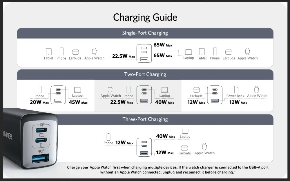 • Connect a single device to get a 65W max charge—that’s enough to power up a 2020 MacBook Pro 13″ at full speed. And when you connect three devices, power will be distributed efficiently between ports to ensure you get the best charge.