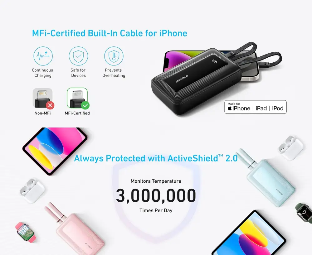 • What You Get: Anker Zolo Power Bank (20K, Built-In USB-C and Lightning Cable)