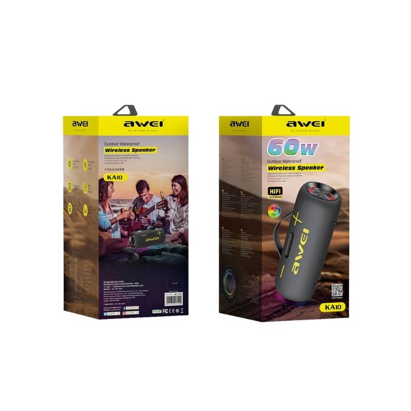 The Awei KA10 60W Wireless RGB Outdoor Speaker delivers powerful bass, vibrant RGB lighting, long battery life, and a rugged portable design. With Bluetooth, TWS pairing, and a splash-resistant build, it’s perfect for outdoor parties, camping, and everyday music on the go.