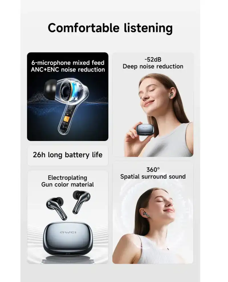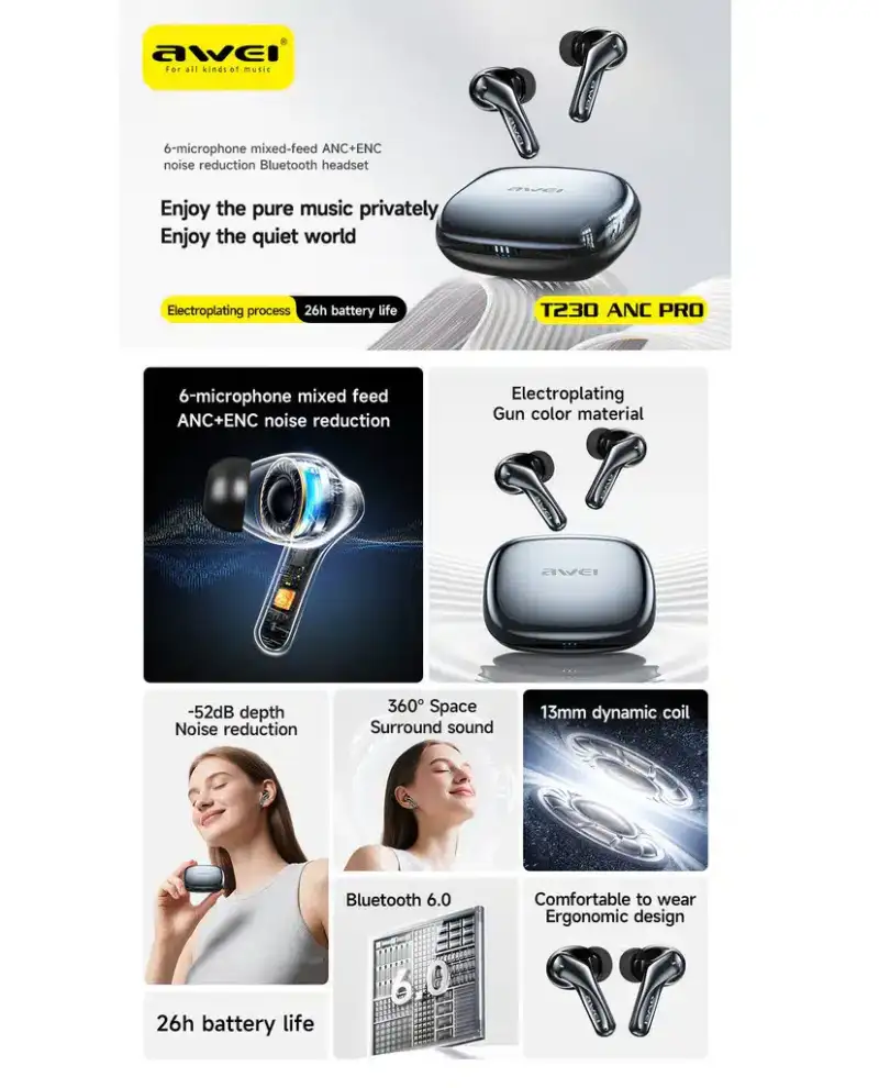 • Superior Noise Control Technology with combined Active Noise Cancellation (ANC) and Environmental Noise Cancellation (ENC) on the Awei T230 ANC Pro delivers an immersive listening experience by significantly reducing background sounds while enhancing voice clarity during calls, making them ideal for busy environments, commuting, and travel.