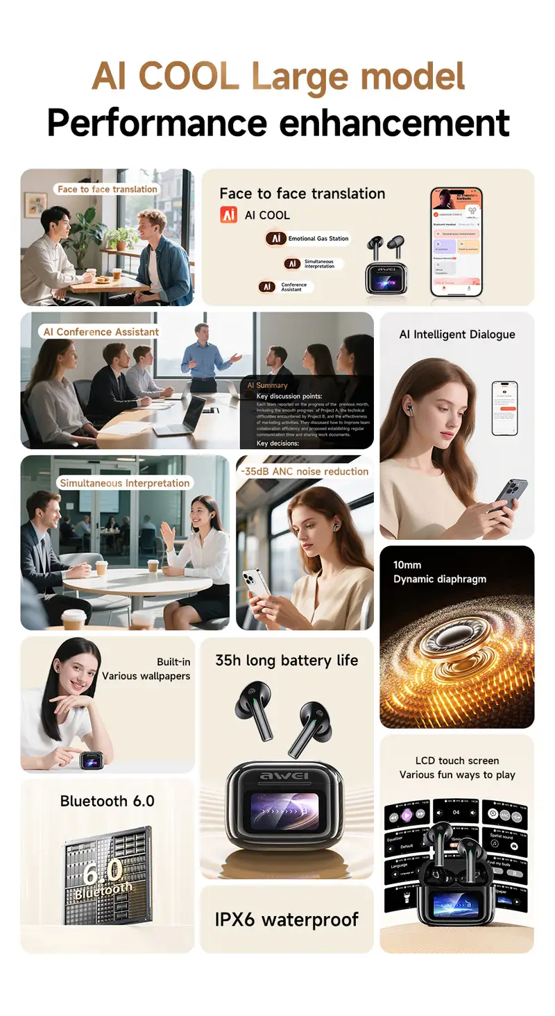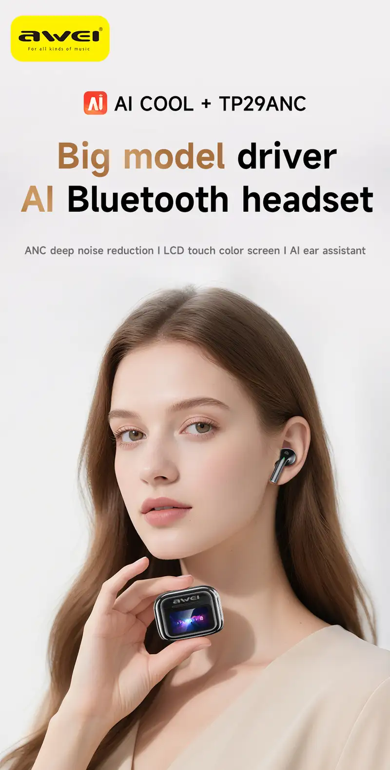 A clean studio close-up of the Awei TP29 ANC wireless earbuds, A lifestyle image showing the earbuds in use during travel,