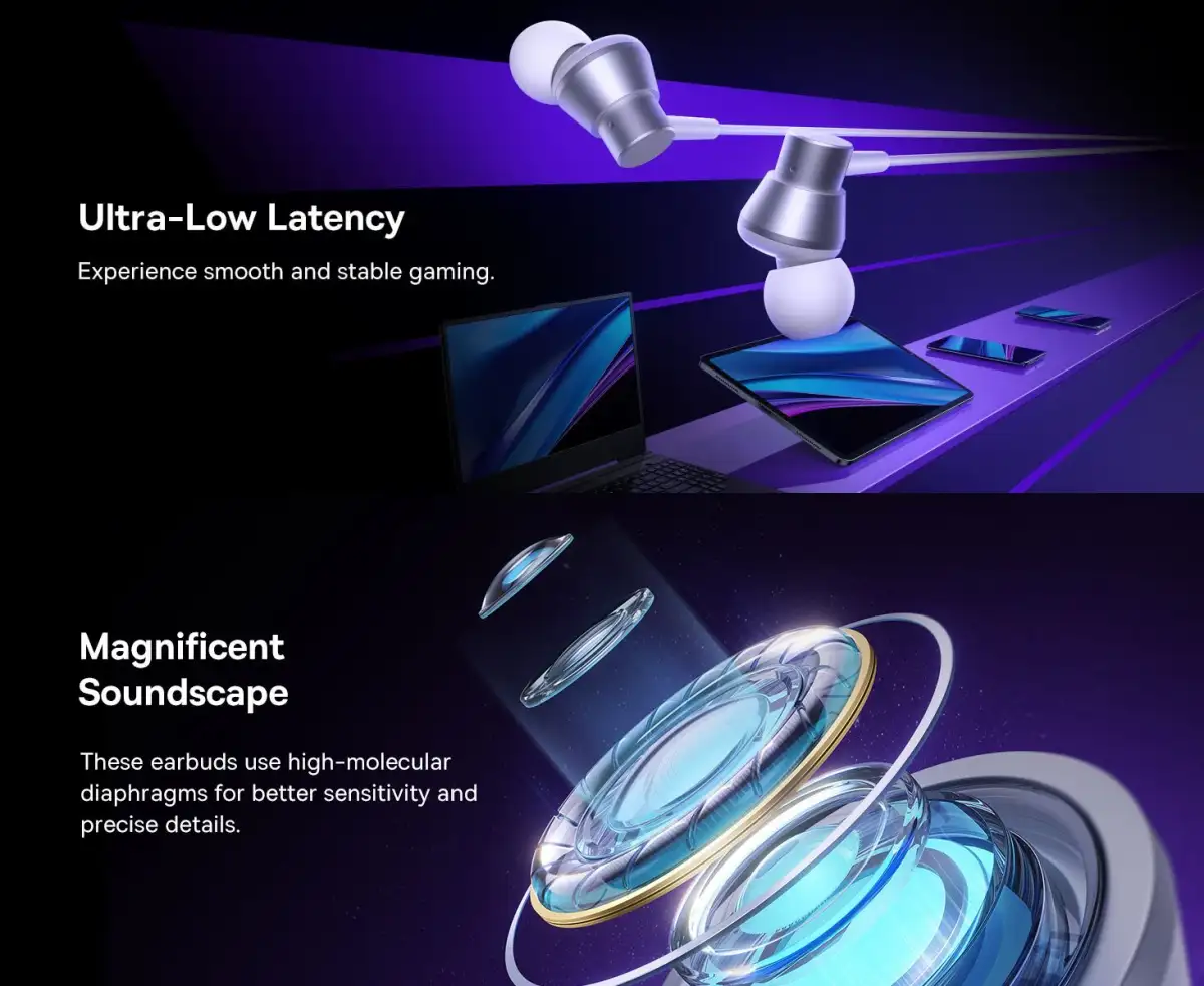 • Dynamic Audio: 10mm dynamic drivers deliver clear highs, balanced mids, and deep bass.