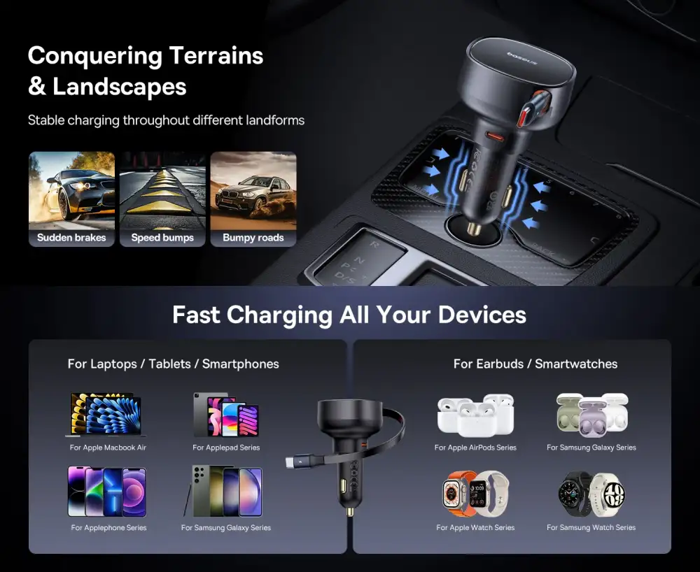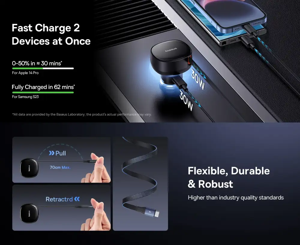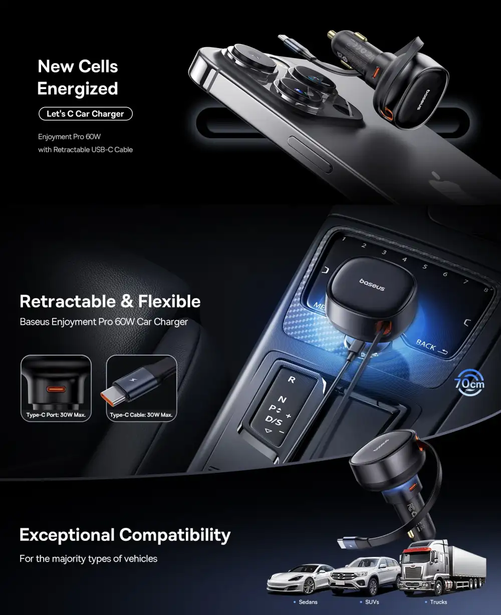 • 60W High-Speed USB-C Power Delivery enables the Baseus Enjoyment Pro Retractable Car Charger to rapidly charge compatible phones, tablets, and PD-enabled devices during travel, significantly reducing charging time while maintaining a stable and reliable output from your vehicle’s 12V/24V socket.