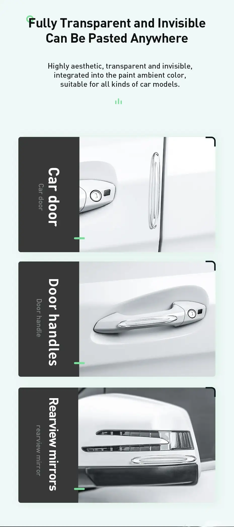• Invisible Slim Protection Design Blends discreetly into the car door edge to protect against scratches, dents, and bumps without altering the vehicle’s appearance.