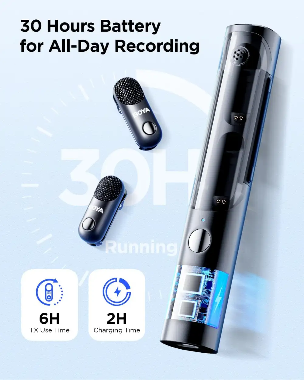 • AI-Powered Intelligent Voice Processing on the Boya Magic-03 The wireless microphone delivers enhanced clarity and adaptive audio optimization, using smart algorithms to improve vocal presence and reduce background interference, making recordings and live streams sound clearer and more professional across varied environments.