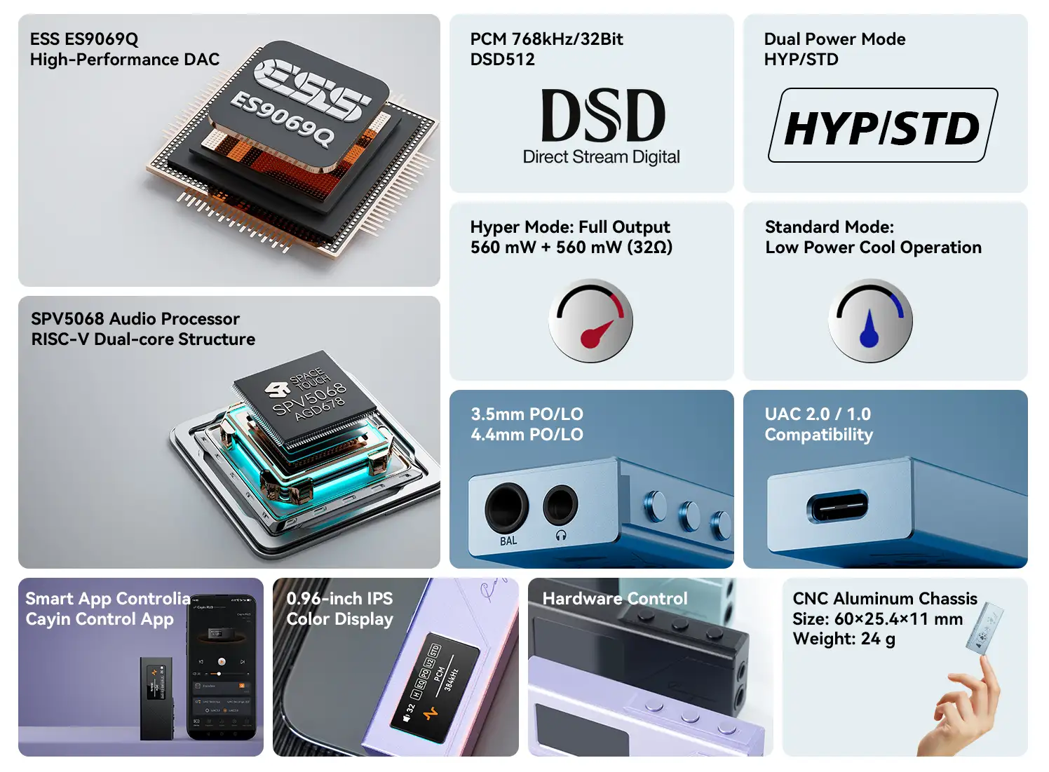 Engineered for precision and portability, the Cayin RU3 delivers high-resolution audio performance in a compact, pocket-sized design. Powered by the ESS ES9069Q high-performance DAC, it supports ultra-high-resolution decoding up to 768kHz/32-bit PCM and DSD512. Hyper Mode output provides dynamic power up to 560mW + 560mW at 32Ω, while a 0.96-inch IPS color display offers clear, intuitive access to key playback information.
