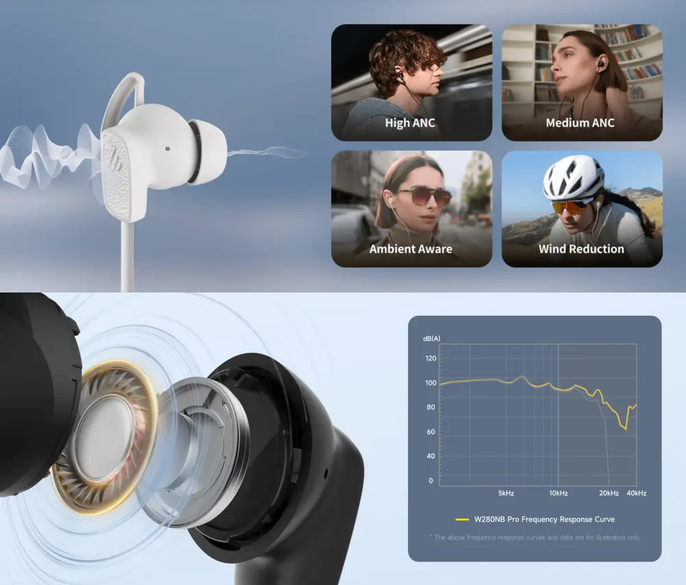 - Hybrid active noise cancellation (ANC) with up to -45dB noise reduction.