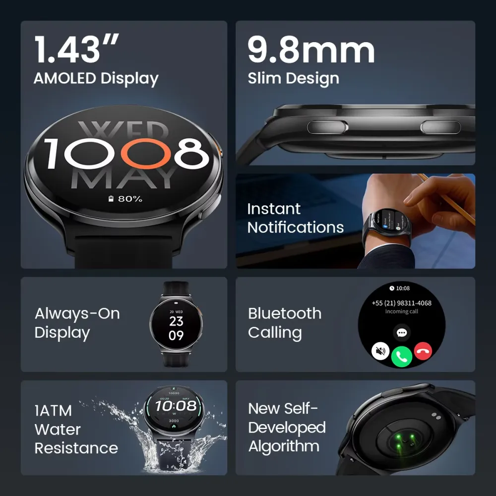 • 1.43″ AMOLED Display: 466×466 resolution with 60Hz refresh rate for smooth visuals.