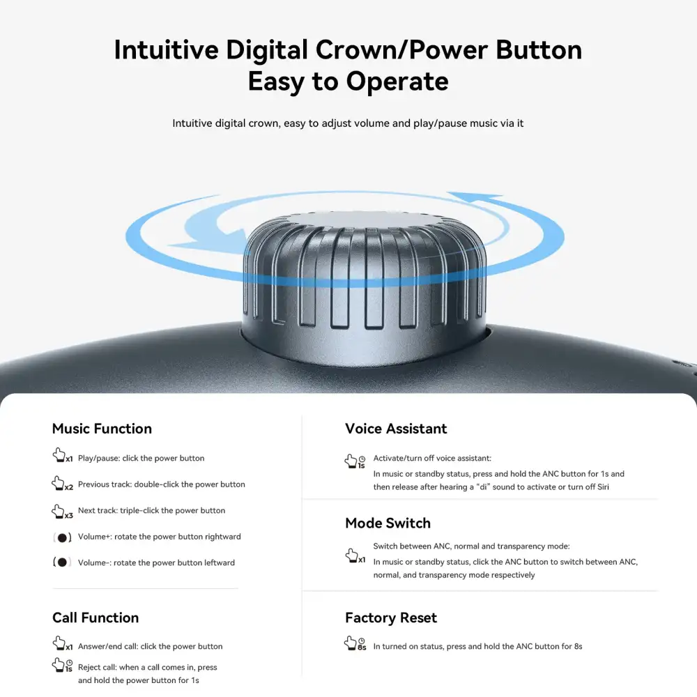 • Controls: On-ear button/touch controls for music, calls, and ANC modes
