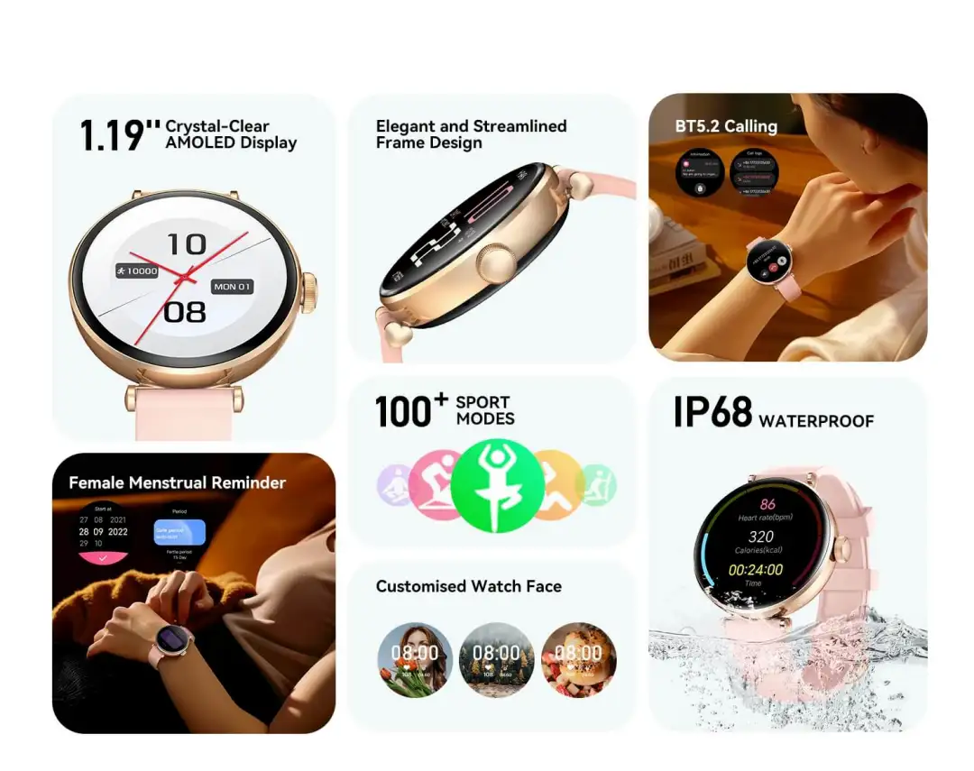 The Kieslect Lady Pura P1 offers BT calling support, health & fitness tracking, and an intuitive touchscreen, making it perfect for calls on the go, activity monitoring, notifications, and daily convenience. It provides comfortable wear, stable connectivity, and long battery life.