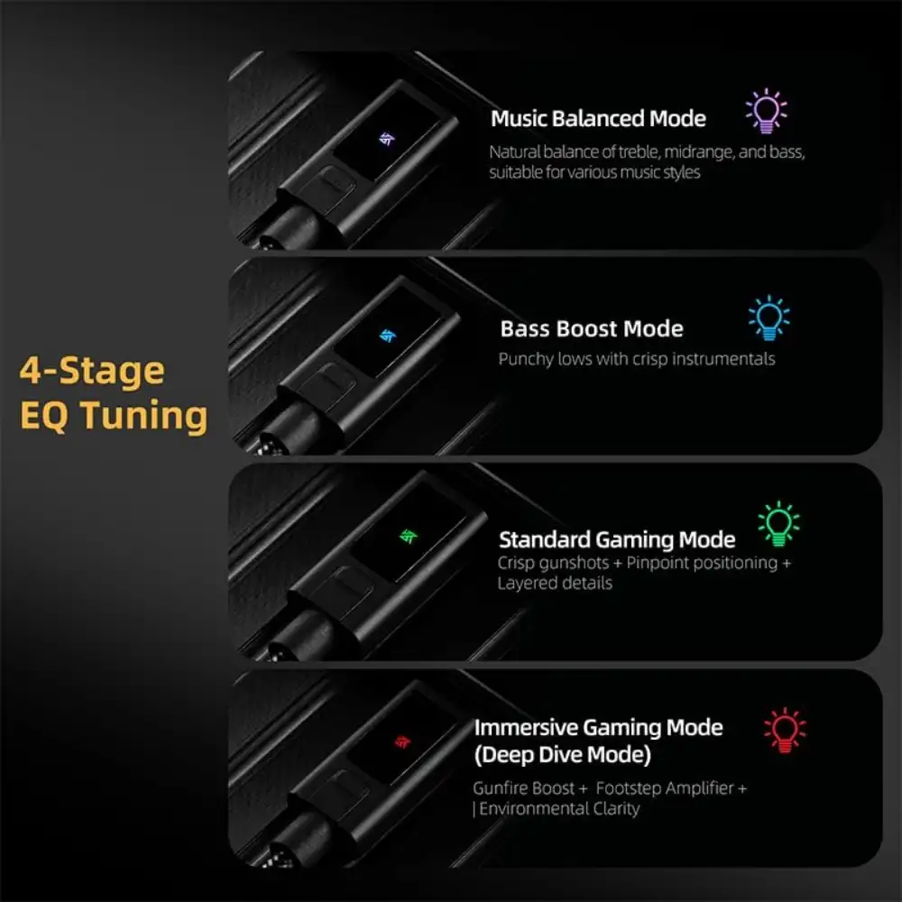 - Switchable EQ Presets for Custom Listening Modes — With four tailored EQ profiles (Balanced, Bass Boost, Standard Gaming, and Immersive Gaming), you can instantly adjust the sound signature based on your music genre or activity, without needing a separate app or manual DSP tuning.