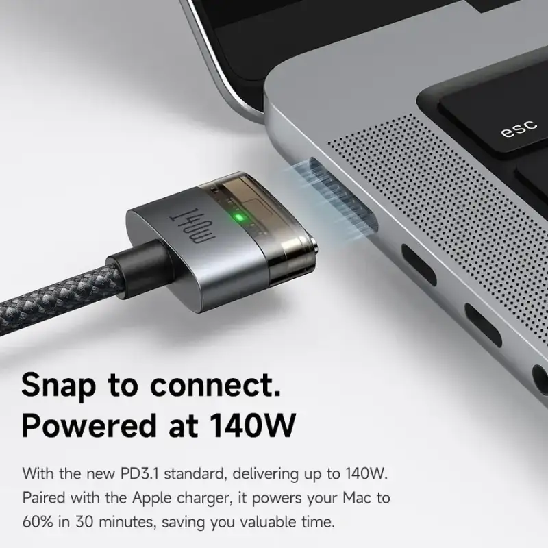 • Up to 140W Power Delivery empowers the Mcdodo CA-207 Cab Luma USB-C to MagSafe 3 Cable to support ultrafast charging for a wide range of devices, including MagSafe-enabled phones, tablets, and laptops, ensuring quick and efficient energy transfer that reduces downtime and enhances daily productivity.