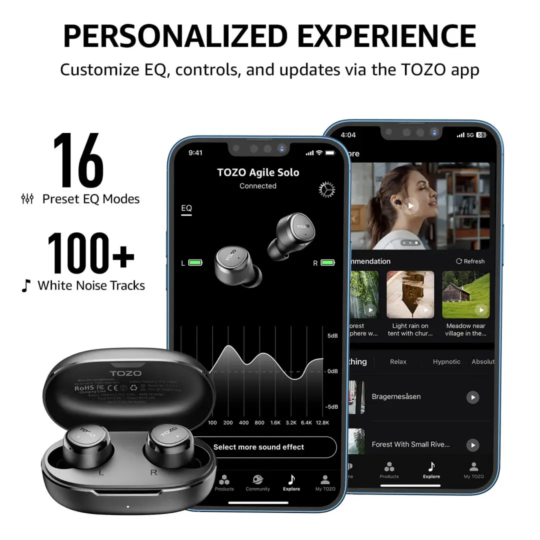 • Immersive Stereo Sound with Customization: Equipped with 6mm dynamic drivers, the TOZO AgileSolo delivers rich, balanced audio with deep bass and crisp highs. Additionally, the TOZO app offers 32 preset modes, allowing you to customize the sound to match your preferences—whether you love bass-heavy beats or a more natural sound profile.