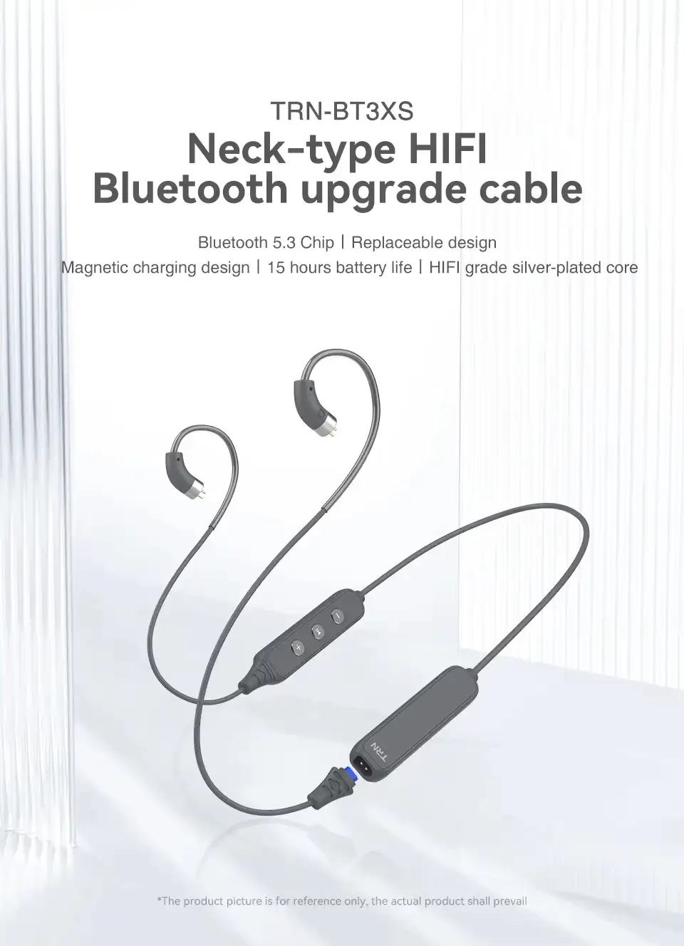 - The TRN BT3XS Neck Type Hi-Fi Bluetooth Upgrade Cable (BT 5.3) is designed to transform your favorite wired IEMs into a high-fidelity wireless experience. Built with precision and audiophile standards, this cable combines advanced Bluetooth 5.3 technology with a lightweight and ergonomic neckband design for maximum comfort and stability during long listening sessions.