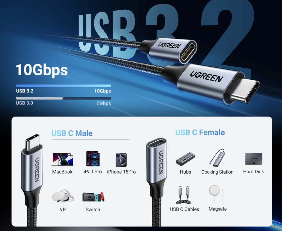 UGREEN USB-C Male to USB-C Female Gen2 Extension Cable (1m) – Built tough with an aluminum case and braided cable. Delivers blazing-fast Gen2 data transfer, stable power, and extended reach with zero compromise. Durable. Reliable. Powerful.
