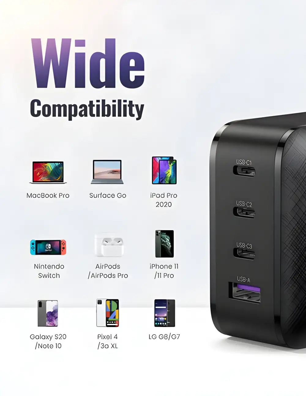 • Multiple Ports: Equipped with 3 USB-C ports and 1 USB-A port, allowing simultaneous charging of multiple devices.
