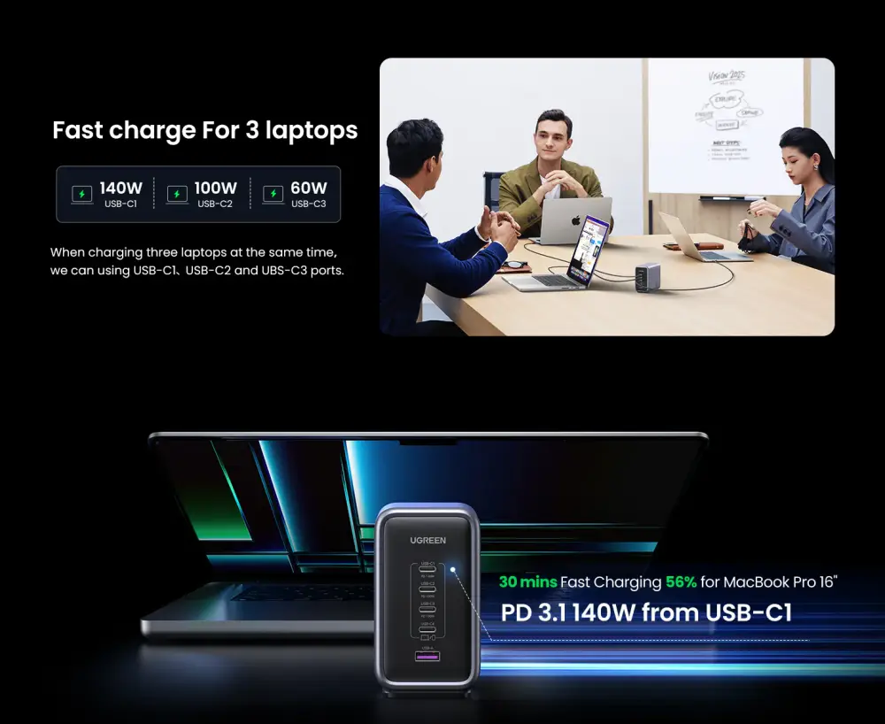 • 3 Laptops Fast Charging: Power three laptops at the same time.(USB C1 port 140W, USB C2 port 100W, USB C3 port 60W)