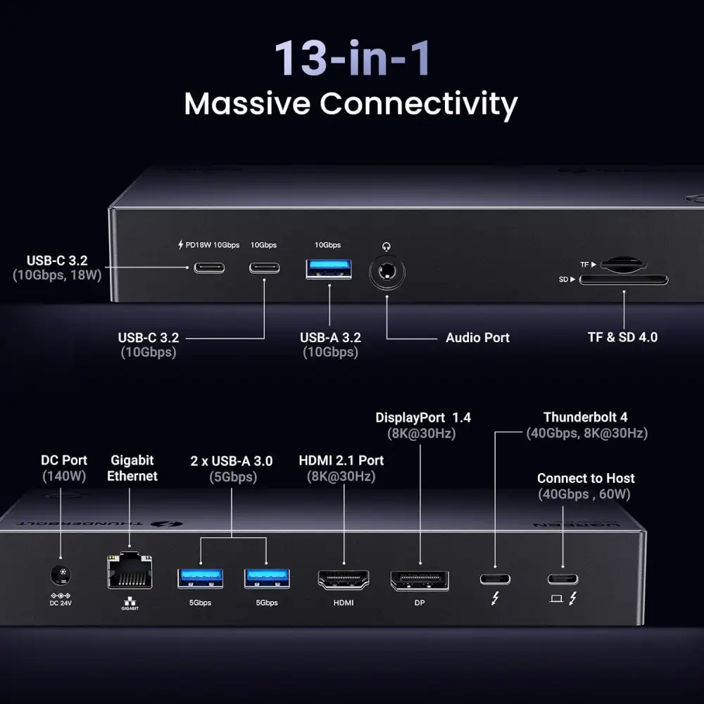 - Full‑range port expansion: 13 ports including Thunderbolt, USB‑C, USB‑A, HDMI, DisplayPort, SD/TF card reader, Ethernet, and audio jack—eliminating the need for multiple adapters.