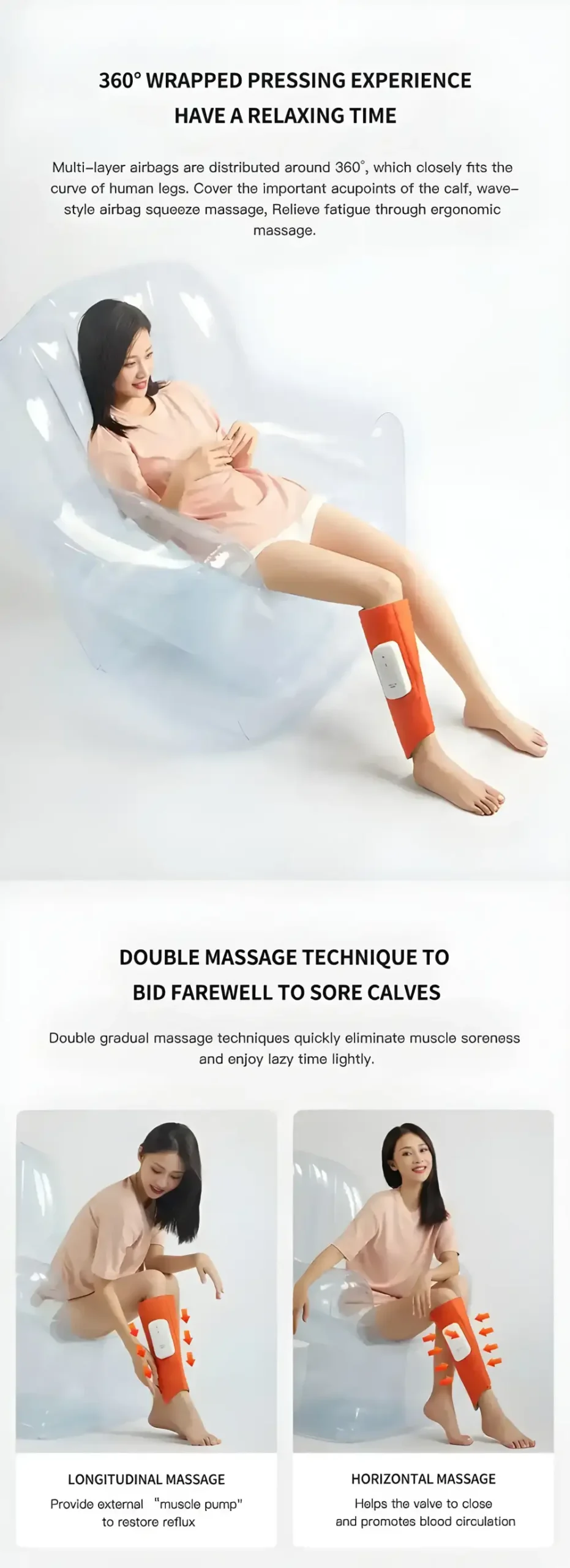 A clean studio shot of the Xiaomi BAMQ-A4V1 KULAX graphene leg massager, A lifestyle image showing the leg massager in use on a relaxed sofa,