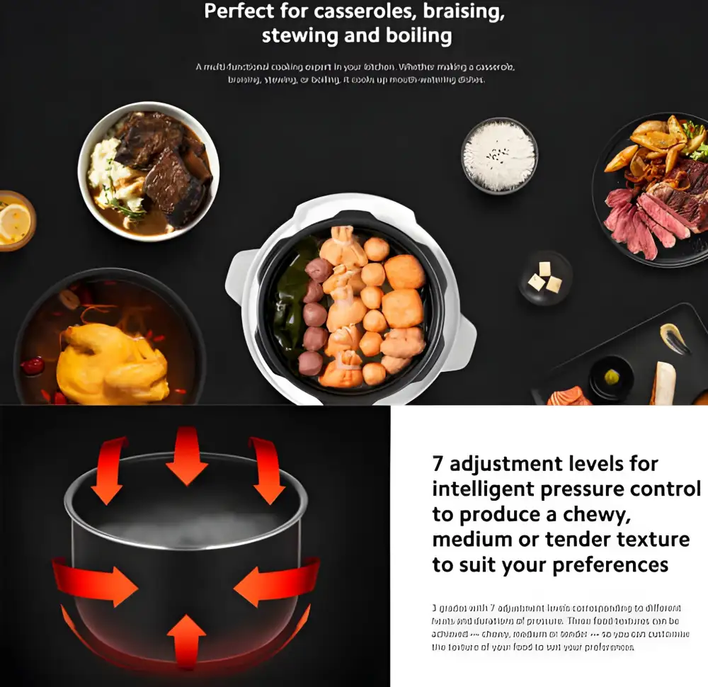 • Adjustable Cooking Modes: 3 pressure levels and 7 texture settings for perfect results.