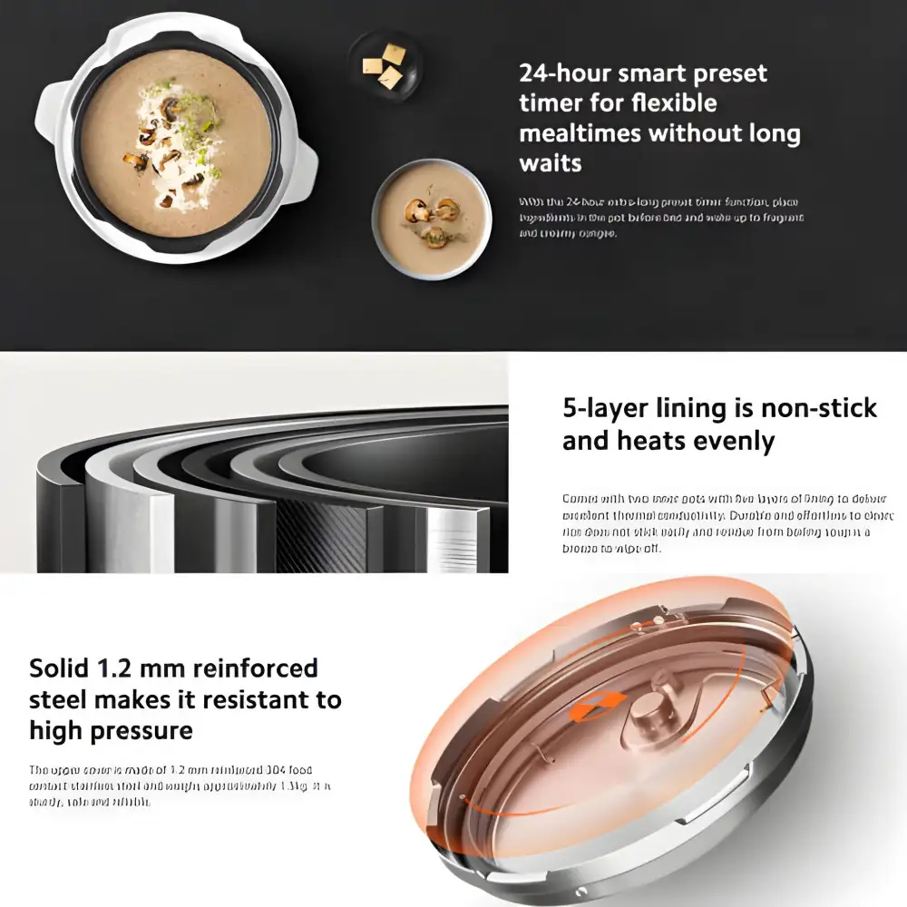 • Smart Preset Timer: 24-hour preset and keep-warm functions for convenient meal prep.
