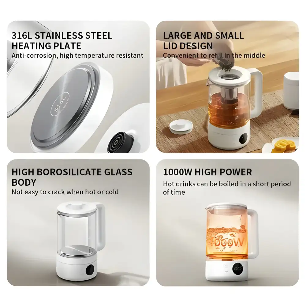 • Constructed with high-borosilicate glass and a 316L stainless steel heating plate, the kettle ensures safe, durable boiling without odor or taste transfer, while the glass body resists thermal shock and remains easy to clean.