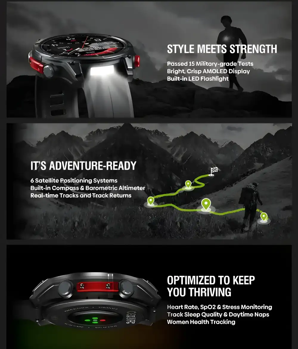 • Advanced Navigation & Multi-Satellite Positioning—Featuring support for six GNSS systems (GPS, GLONASS, GALILEO, NAVIC, QZSS, and BDS), along with a compass, barometric altimeter, and track-return function, the watch ensures precise positioning and route tracking even in dense forests or urban canyons.
